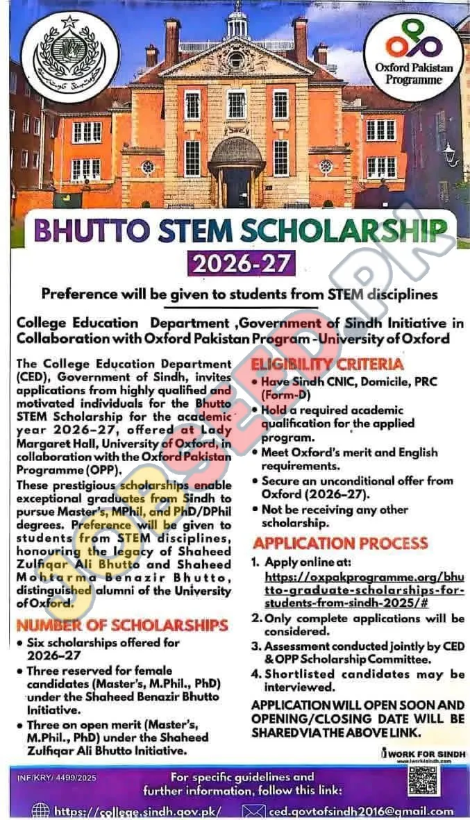 The College Education Department, Government of Sindh offers scholarships for highly qualified and motivated individuals in collaboration with the Oxford Pakistan Program. These prestigious scholarships enable exceptional graduates from Sindh to pursue Master's, MPhil, and PhD/DPhil degrees.