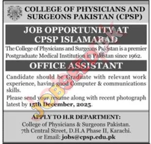 College of Physicians and Surgeons Pakistan, Karachi Sindh Pakistan invites applications from eligible candidates for the post of Office Assistant as per advertisement of 01 December, 2025, published in Jang Newspaper. Bachelor educational qualification will be preferred.