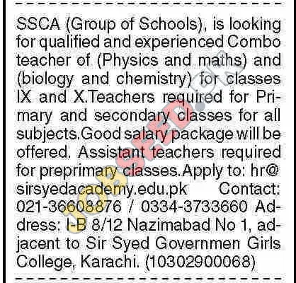 SSCA (Group of Schools) is seeking dedicated and qualified teachers to join their team in Karachi. They are looking for a Combo Teacher proficient in teaching Physics, Maths, Biology, and Chemistry to classes IX and X. Additionally, they are seeking Teachers for primary and secondary classes, covering all subjects and Assistant Teachers for preprimary classes. This is an excellent opportunity to contribute to the academic growth of students within a supportive environment. A good salary package will be offered to successful candidates.