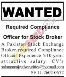 A leading private sector stock brokerage firm is actively seeking a skilled Compliance Officer to join their team. This is an excellent opportunity for professionals with experience in the financial sector. Additionally, Finance jobs in are available for qualified candidates. The ideal candidate will have in-depth knowledge of compliance regulations, excellent analytical skills, and a commitment to maintaining ethical standards. This role offers a competitive salary and the potential for career growth within a dynamic environment. The firm is recognized for its commitment to excellence and provides a supportive atmosphere for their employees.
