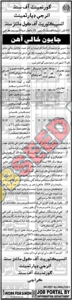 The Directorate of Coal Mines, Karachi, under the Energy Department, Government of Sindh, is seeking qualified and experienced candidates to fill vacant positions. Domiciled candidates from Sindh province are encouraged to apply. This advertisement is published to invite applications within 15 days from the date of publication.