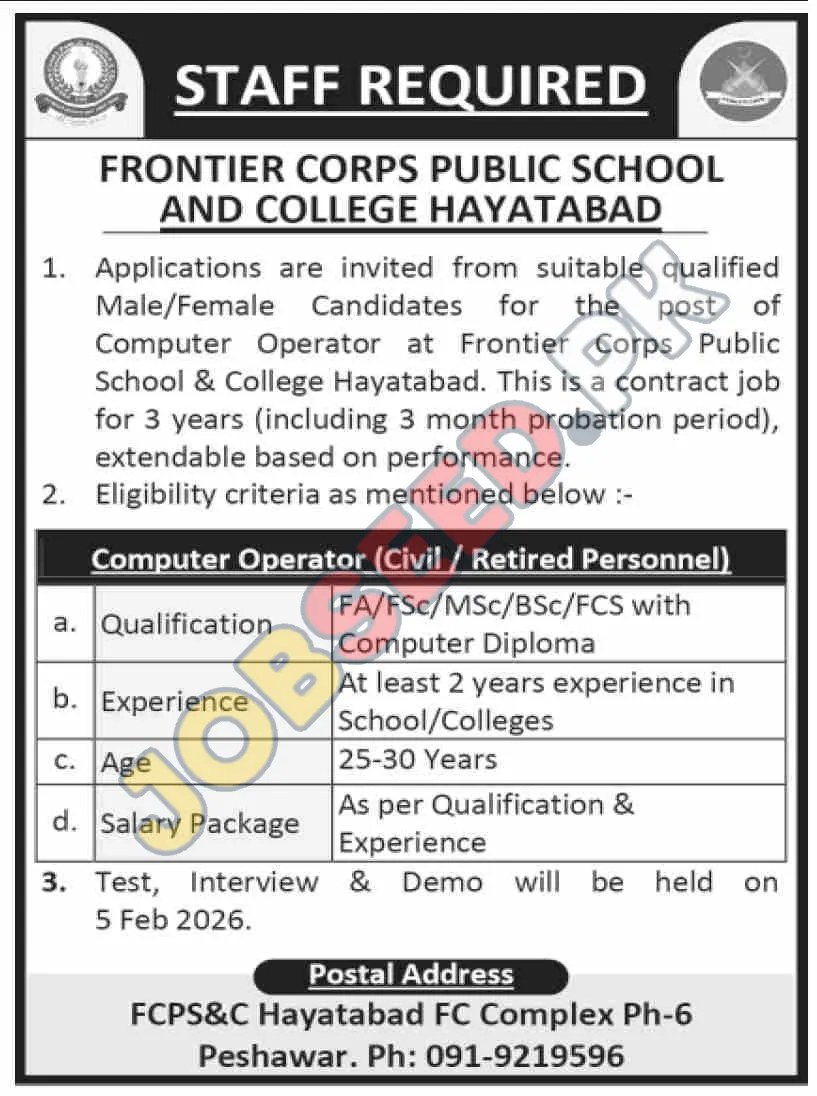 Computer Operator Position at Frontier Corps Public School & College Hayatabad