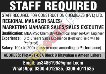 Construction Chemical Company, Lahore Punjab Pakistan invites applications from eligible candidates for the post of Regional Manager Sales, Marketing Manager Sales and Sales Executive as per advertisement of 27 November, 2025, published in Express Newspaper. BA educational qualification will be preferred.