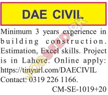 Construction Company, Lahore Punjab Pakistan invites applications from eligible candidates for the post of Civil Engineer as per advertisement of 01 December, 2025, published in Jang Newspaper. DAE educational qualification will be preferred.