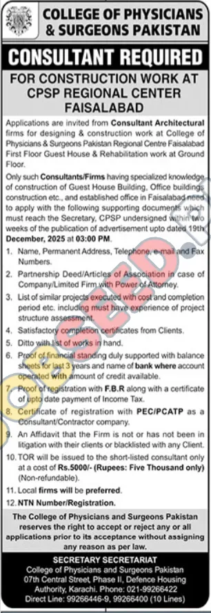 College of Physicians & Surgeons Pakistan is seeking applications from Consultant Architectural firms for designing & construction work at the CPSP Regional Centre Faisalabad. This role involves contributing to projects such as the First Floor Guest House & Rehabilitation work at Ground Floor.