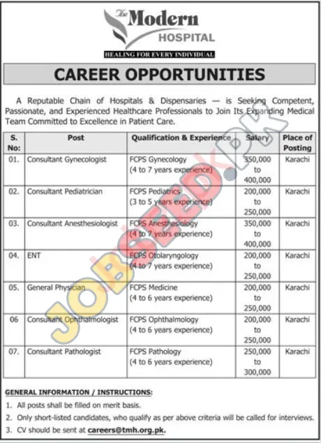 Interested individuals should apply directly to The Modern Hospital for these vacancies in the Medical division. The estimated application deadline is 15 December, 2025, but please verify the exact date in the official advertisement. To understand the application process and explore other job openings at The Modern Hospital, visit the official source or see more details on https://www.jobseed.pk.