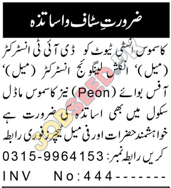 Cosmos Institute is currently seeking motivated individuals to fill several key roles. We have openings for both male and female candidates who are passionate about education and dedicated to providing quality instruction. We are looking for a DIT Instructor, an English Language Instructor, an Office Boy (Peon), and Teachers for cosmos model school.