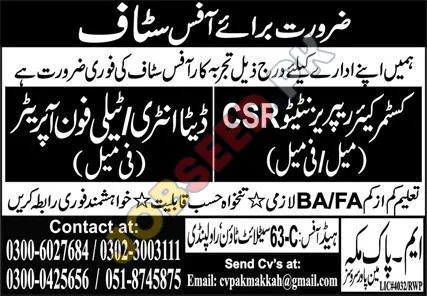 A reputable private sector organization in Rawalpindi is currently hiring experienced office staff. This is a great chance to build a career in a strong and expanding business. Additionally, Latest Customer Service careers are available for qualified candidates. These positions demand individuals with prior knowledge and the capacity to tackle everyday duties expertly. The company provides a working environment that promotes career growth and supports continuous professional enhancement to all its employees. This is a remarkable chance to grow and grow personally in a well-established company.