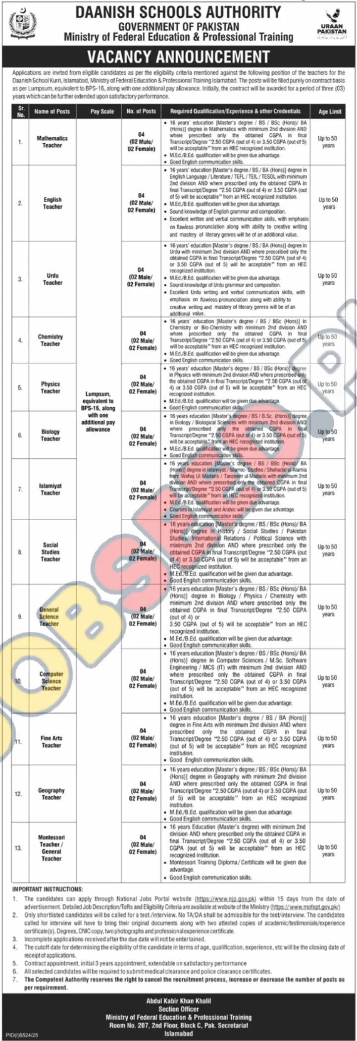 All positions require a minimum of 16 years of education and a CGPA of 2.50 (out of 4) or 3.50 (out of 5) from an HEC recognized institution. M.Ed./B.Ed. qualification will be considered an advantage. Age limit is up to 50 years.