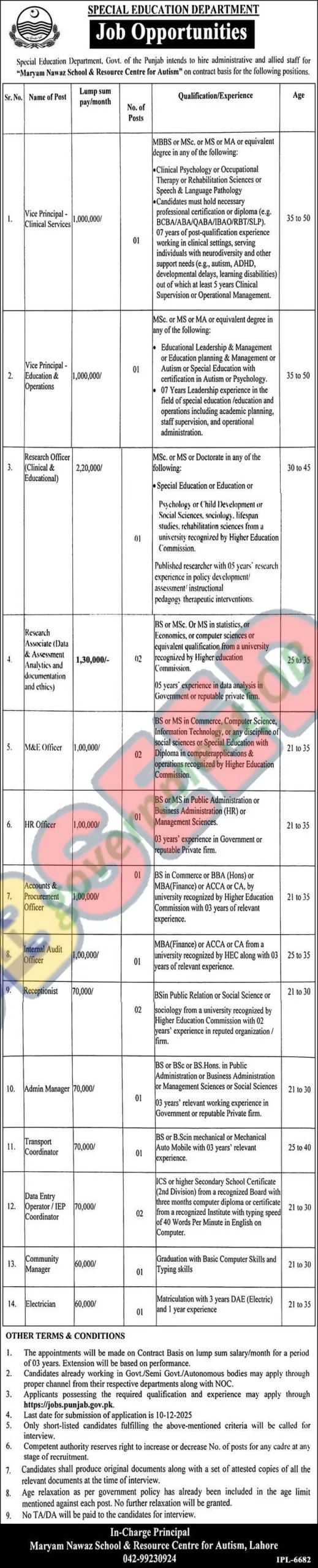 The Special Education Department, Govt. of the Punjab, is seeking talented and dedicated individuals to join the team at Maryam Nawaz School & Resource Centre for Autism. These contract-based positions offer a unique opportunity to contribute to a supportive and impactful environment for children with autism.