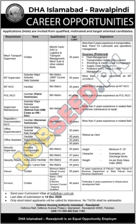Defence Housing Authority DHA, Islamabad Islamabad Pakistan invites applications from eligible candidates for the post of Mech Transport Supervisor, MT Supervisor, MT NCO, POL NCO (Petrol Technician), Supervisor Maintenance, Regulation / Documentation NCO (Storeman Technician), Office Superintendent, Office Assistant, Security Supervisor, Security Guard, Patwari and Surveyor as per advertisement of 07 December, 2025, published in Jang Newspaper. BA, Matric educational qualification will be preferred.