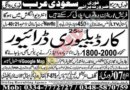 Ittefaq Recruiting Agency has announced hiring for Delivery Drivers in Saudi Arabia. This offers an excellent opportunity in the private sector, along with a lucrative employment package and immediate starts. Explore these competitive salary with competitive benefits. If you want high-paying career or government jobs in Saudi Arabia, this is for you. The employer offers competitive salaries, benefits. This opportunity also emphasizes professional development.