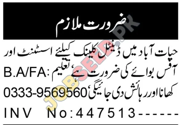 Join the team at Dental Clinic in Peshawar Khyber Pakhtunkhwa, Khyber Pakhtunkhwa KPK. They are seeking to hire 2 qualified individuals for the roles of Office Boy and Dental Clinic Assistant. This is a Full-Time position. This career opportunity was advertised on 29 November, 2025 in Aaj Newspaper. The last date to apply is 13 December, 2025. Don't miss this chance to advance your career with Dental Clinic. For more information and to apply online, visit https://www.jobseed.pk.