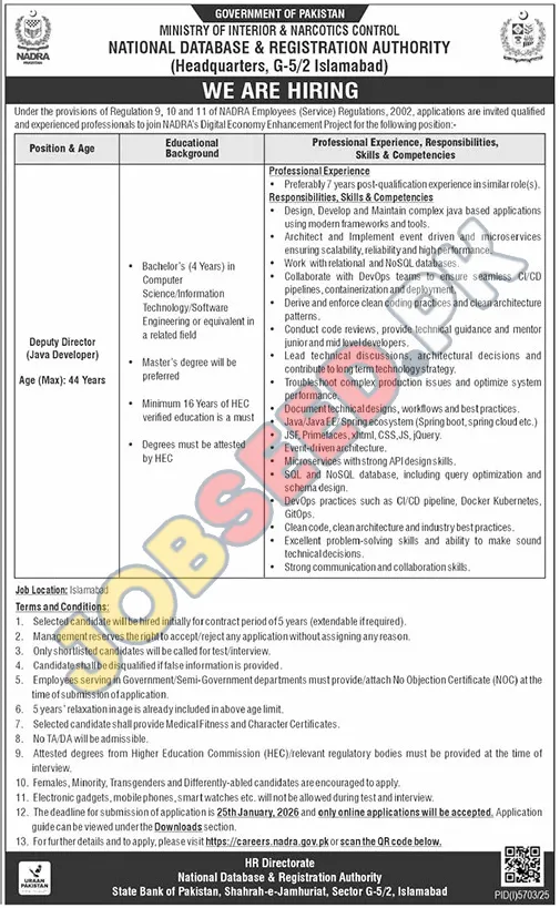 National Database & Registration Authority (NADRA), Islamabad invites applications from eligible candidates for the post of Deputy Director (Java Developer) as per advertisement of 13 January, 2026. BA educational qualification will be preferred.