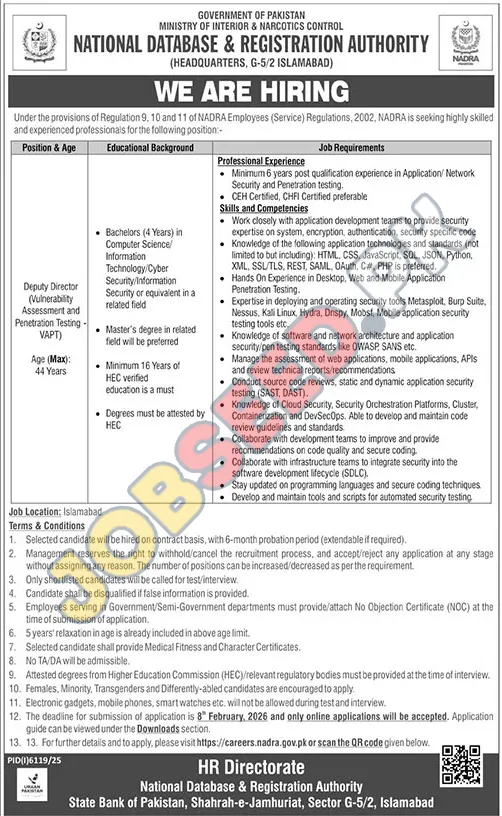 The National Database & Registration Authority (NADRA), a government organization, is hiring a Deputy Director specializing in Vulnerability Assessment and Penetration Testing (VAPT). The ideal candidate will have experience in application/network security and penetration testing. This position is located in Islamabad and offers a competitive salary. The closing date for submission of application is 8 February, 2026. This role is crucial for ensuring the security of national data.