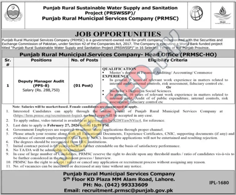 Explore new government career opportunities in Lahore with PRMSC. The company is hiring a Deputy Manager Audit to oversee financial controls and risk management for a World Bank project. Applicants must have a Master's degree in Finance or a Bachelor's degree in Social Sciences with significant experience in public sector auditing. Apply online before the deadline on February 27, 2026.