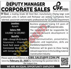 FF Steel, a leading private sector steel manufacturer, is hiring a Deputy Manager of Corporate Sales in Karachi. This role requires 3-5 years of experience in corporate sales with a focus on building materials. Benefits include EOBI, group life & health insurance, provident fund, paid leave, sales commission, and company-maintained car. Apply by February 22, 2026.