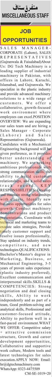 Join the team at DG Tech Machinery in Lahore, Punjab. They are seeking to hire 2 qualified individuals for the roles of Sales Manager and Sales Representatives. This is a Full-Time position. This career opportunity was advertised on 01 December, 2025 in Jang Newspaper. The last date to apply is 16 December, 2025. Don't miss this chance to advance your career with DG Tech Machinery. For more information and to apply online, visit https://www.jobseed.pk.
