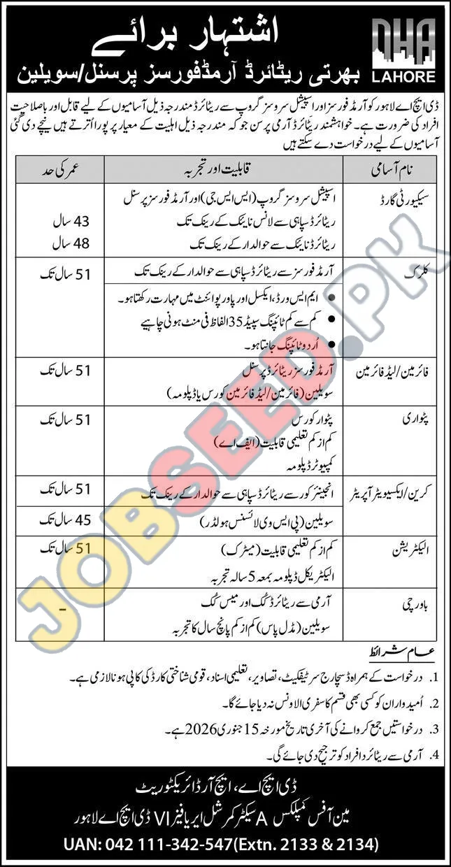 DHA, Lahore invites applications from eligible candidates for the post of Security Guard, Clerk, Fireman/Allied Fireman, Patwari, Crane/Excavator Operator, Electrician and Cook as per advertisement of 01 January, 2026. Intermediate, Diploma, Matric, Middle educational qualification will be preferred.