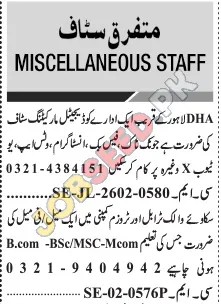 | 1 | Marketing Staff | B.Com, BSc, MSc, M.Com | Lahore |