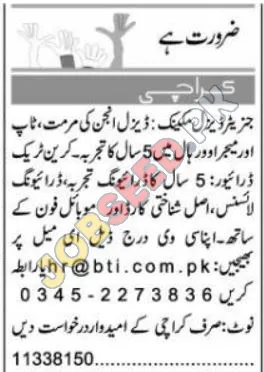 Career opportunity at Base Ten International BTI located in Karachi Sindh Pakistan for the position of Diesel Mechanic. This employment notice was announced on 01 December, 2025 through Express Newspaper. Candidates possessing a Matric degree are encouraged to submit their application.