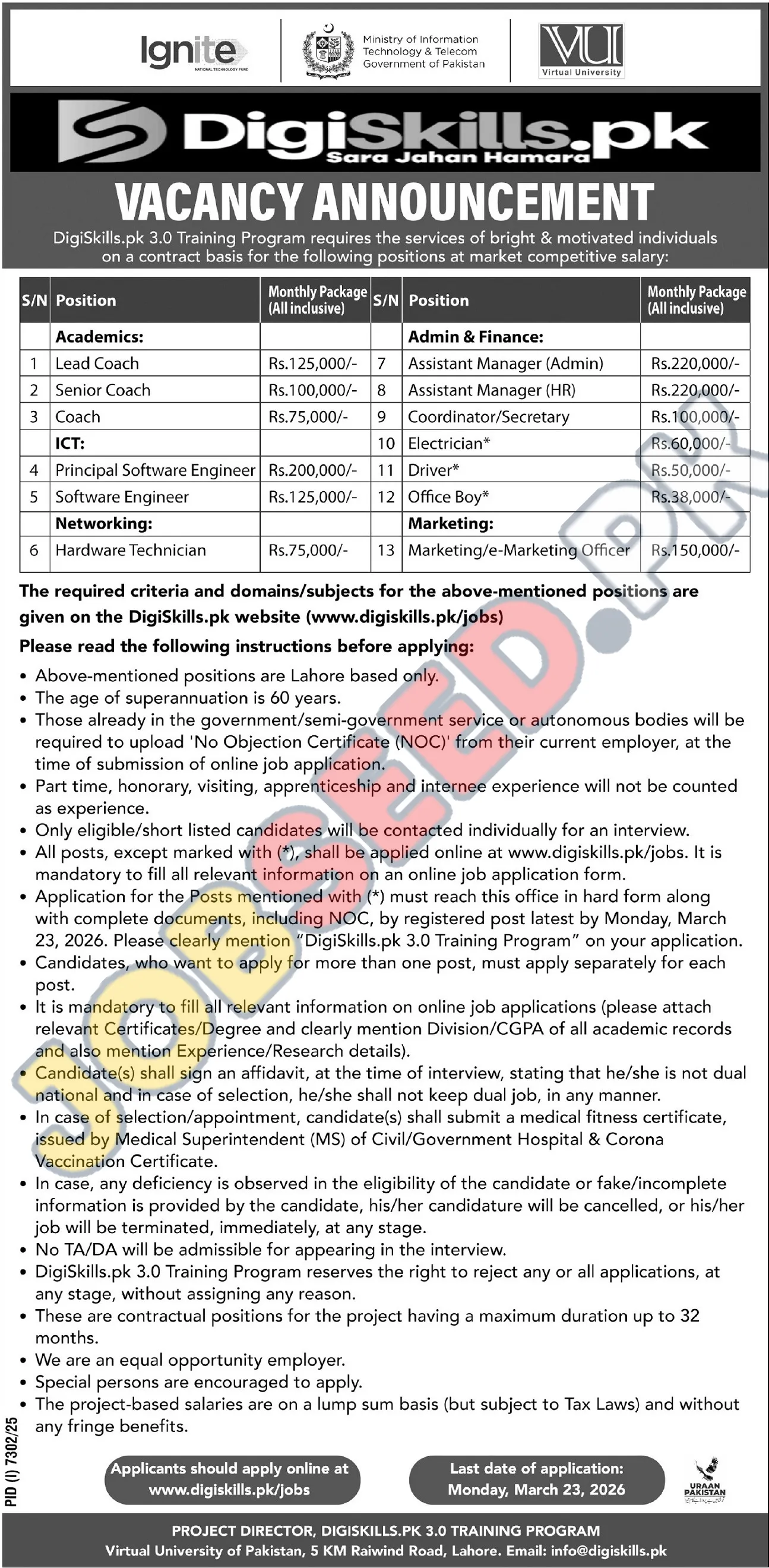 - Hard Copy Submission (for specific posts): For posts marked with (*), applications along with a No Objection Certificate (NOC) from the current employer must reach the office by Monday, March 23, 2026. Clearly mention "DigiSkills.pk 3.0 Training Program" on your application.