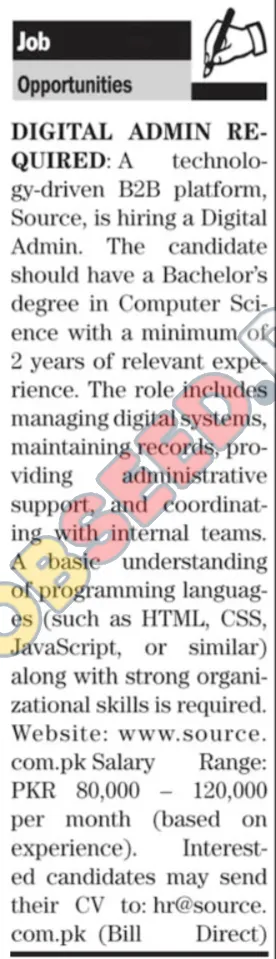 A technology-driven B2B platform, Source, is hiring a Digital Administrator in Pakistan. The role requires a Bachelor's degree in Computer Science and at least 2 years of experience in digital systems management and administrative support. Candidates with knowledge of HTML, CSS, and JavaScript are encouraged to apply for this full-time position.