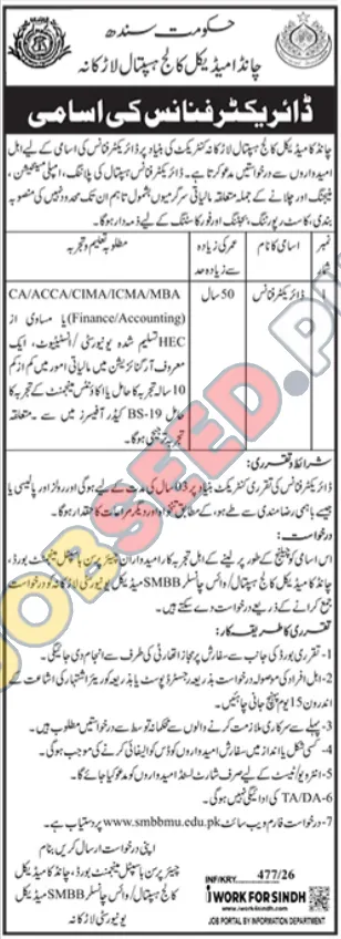 - Application Address: Send the complete application package to the Chairman Hospital Management Board, Chandka Medical College Hospital / Vice Chancellor SMBB Medical University Larkana.