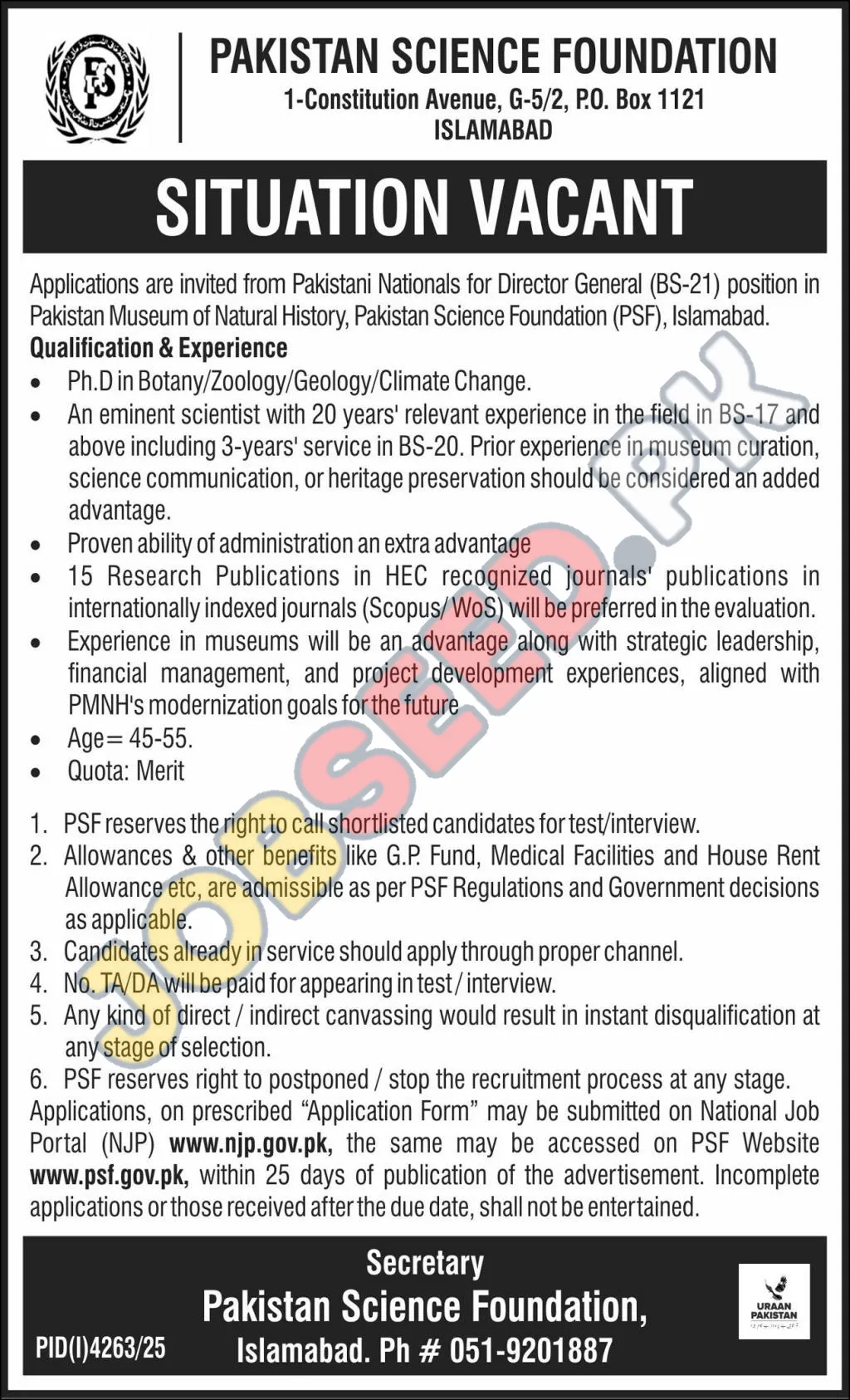 The Pakistan Science Foundation (PSF) is seeking applications from qualified Pakistani nationals for the position of Director General (BS-21) in the Pakistan Museum of Natural History. This is an excellent opportunity to lead and contribute to the advancement of science and natural history in Pakistan.