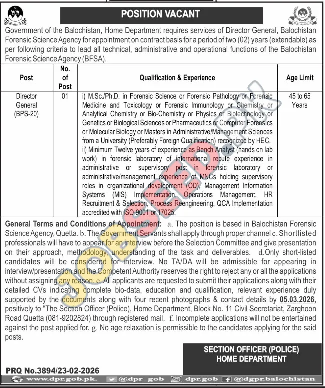 Director General - Forensic Science Agency | Government of Balochistan Careers