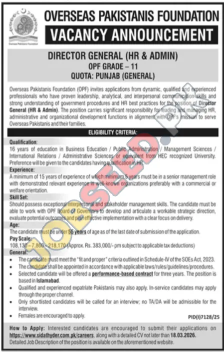Overseas Pakistanis Foundation (OPF) is announcing a vacancy for Director General (HR & Admin), Grade 11. This government role requires 16 years of education in relevant fields and a minimum of 15 years of experience, including 5 years in senior management. Explore these latest recruitment with competitive benefits. The position is based in Islamabad and offers a performance-based contract. Ideal candidates will possess exceptional interpersonal and stakeholder management skills. This is a prime opportunity for career advancement in the public sector.