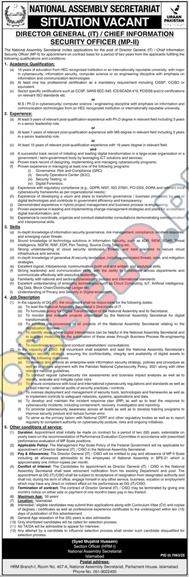The National Assembly Secretariat is hiring a Director General (IT) / Chief Information Security Officer (CISO) for a two-year contract. Successful applicants will be responsible for leading the IT department, developing cybersecurity strategies, and ensuring data protection with high-level qualifications, and relevant experience. This key role in Islamabad offers a lucrative salary package within the government sector, providing an opportunity for valuable professional growth, and advancement in career development.