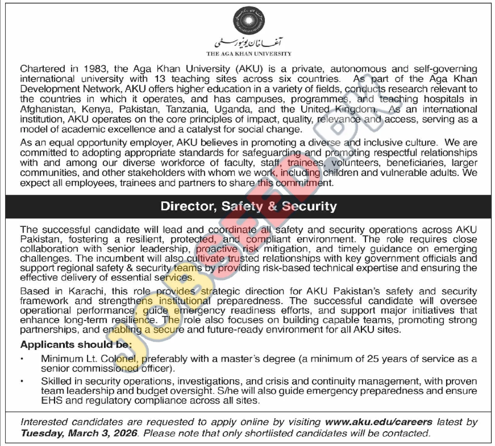 Aga Khan University (AKU), a prominent private international university with a global footprint, is seeking a highly qualified and experienced professional to fill the critical role of Director, Safety & Security. This position is instrumental in ensuring a safe, secure, and compliant environment across all AKU campuses and facilities in Pakistan. The university is dedicated to upholding the highest standards of academic excellence and operational integrity, and this role plays a vital part in achieving these objectives.