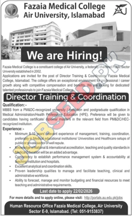 Fazaia Medical College, a distinguished constituent college of Air University, Islamabad, is inviting applications for the position of Director Training & Coordination. This represents a significant opportunity to join a leading public sector institution known for its commitment to professional growth and competitive benefits. This role is ideal for experienced leaders looking to make a meaningful impact. The ideal candidate will provide strategic vision and effective leadership.