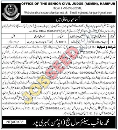The Office of the Senior Civil Judge (Admin) in Haripur has announced new job vacancies for local residents. These positions offer a chance to join the judicial department in a support role. The recruitment drive seeks dedicated individuals for the position of Naib Qasid (BPS-03).