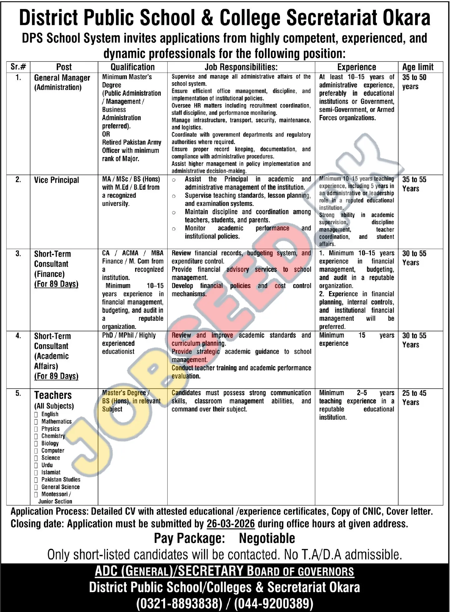 District Public School & College Secretariat Okara Hiring: General Manager, Vice Principal, Consultants & Teachers
