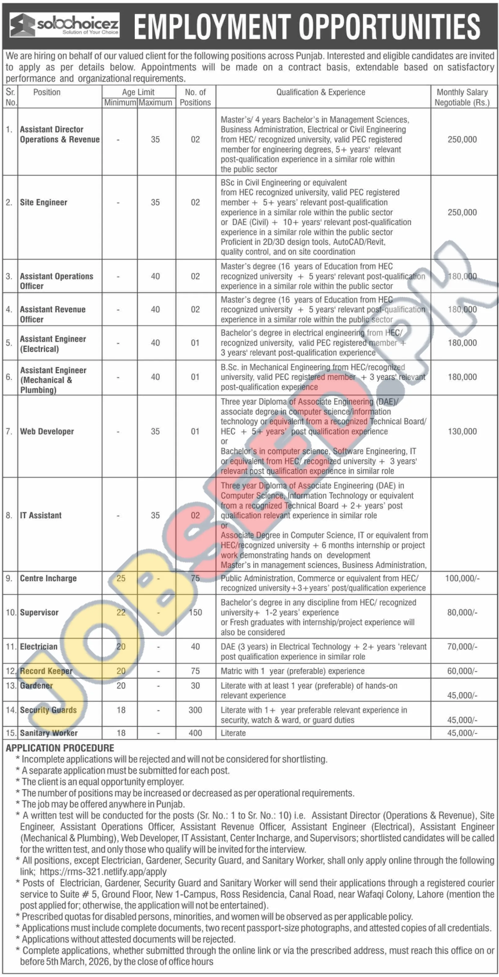 This advertisement outlines contract-based employment opportunities across Punjab, managed by Solochoicez on behalf of their client. The roles span engineering disciplines, including Site Engineer, Assistant Engineer (Electrical), Assistant Engineer (Mechanical & Plumbing), and IT-related positions like Web Developer and IT Assistant. Public sector experience is often preferred for senior roles. The client is an equal opportunity employer, and positions are extendable based on performance. This is a significant chance for career development in the private sector. Additionally, Latest Solochoicez careers are available for qualified candidates.