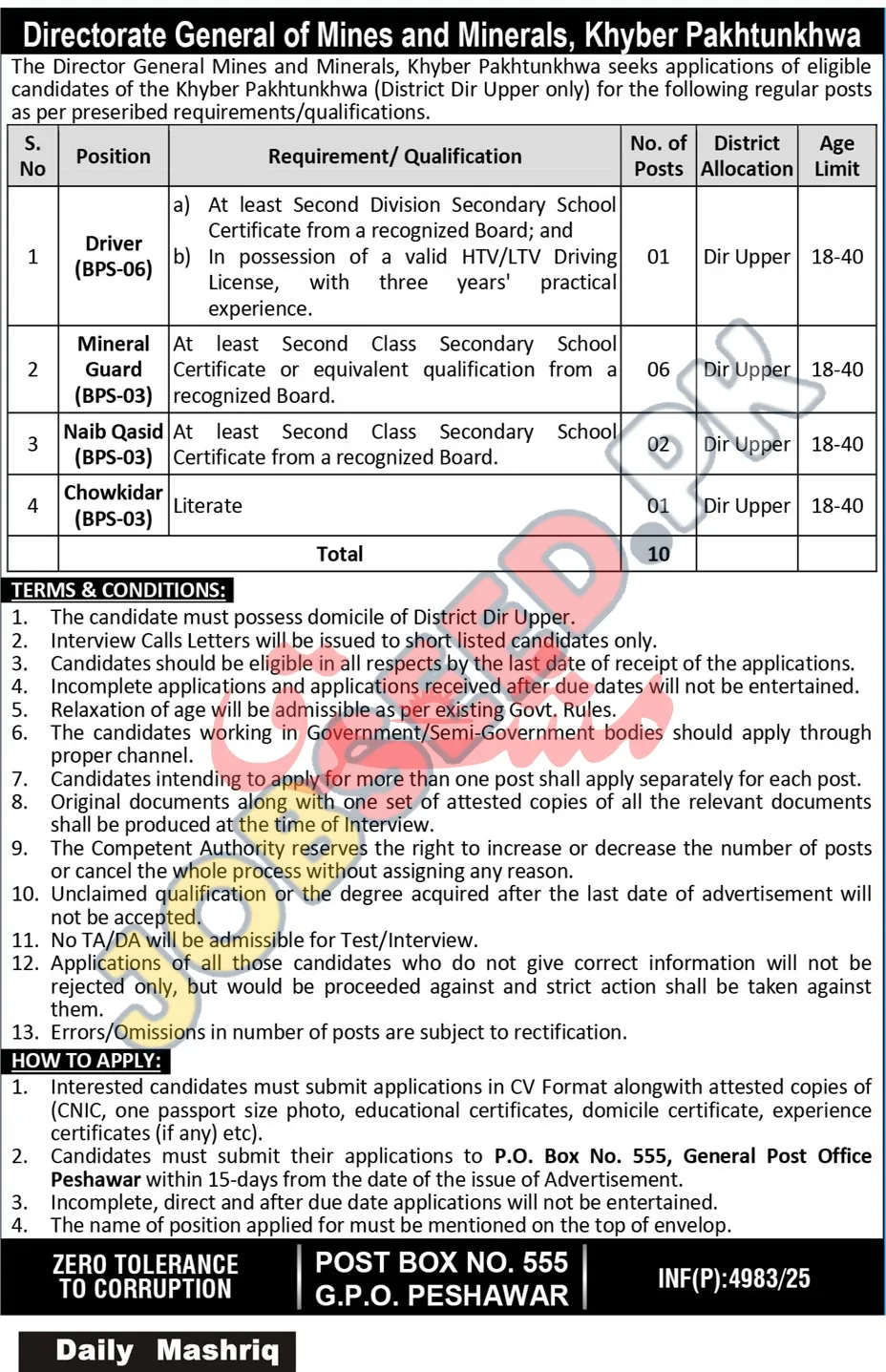Career opportunity at Directorate General Mines & Minerals Khyber Pakhtunkhwa located in Peshawar Khyber Pakhtunkhwa KPK Pakistan for the position of Driver. This employment notice was announced on 28 November, 2025 through Mashriq Newspaper. Candidates possessing a Matric degree are encouraged to submit their application.