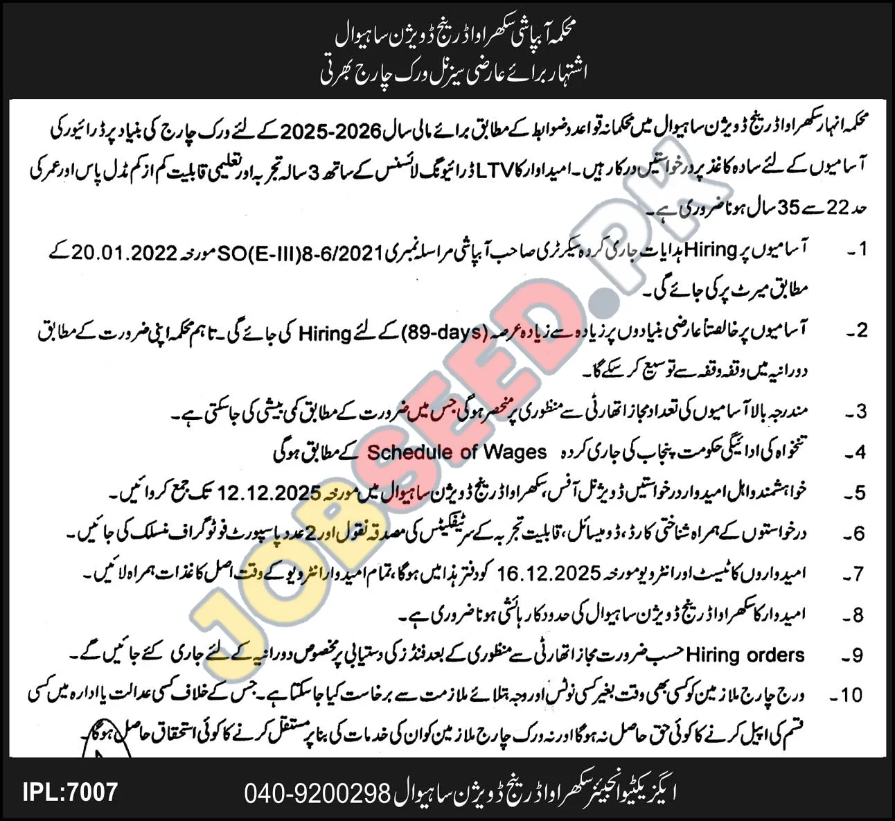 The Irrigation Department, Sukkur Barrage Division Sahiwal, is seeking qualified candidates for Driver positions on a work-charge basis for the fiscal year 2025-2026. This is an excellent opportunity to join a reputable organization and contribute to the efficient operation of our water resource management system.
