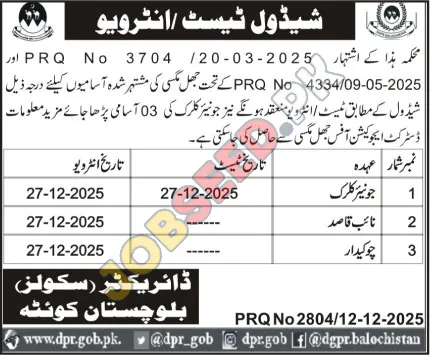 Join the team at Education Department in Quetta, Balochistan. They are seeking to hire 3 qualified individuals for the roles of Junior Clerk, Naib Qasid and Chowkidar. This is a Full-Time position. This career opportunity was advertised on 13 December, 2025. The last date to apply is 27 December, 2025. Don't miss this chance to advance your career with Education Department. For more information and to apply online, visit https://www.jobseed.pk.