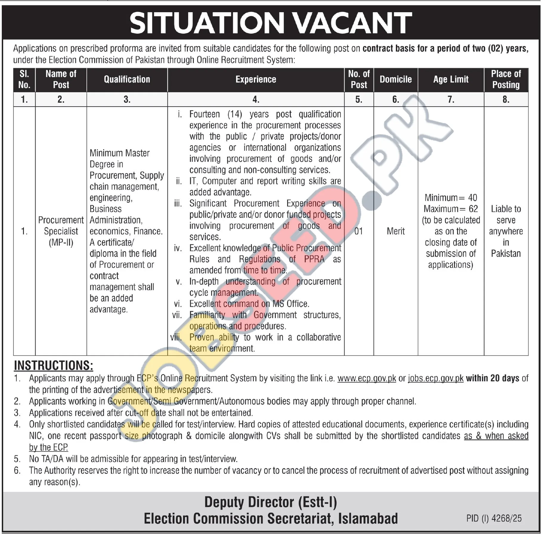 Election Commission of Pakistan ECP, Islamabad Islamabad Pakistan invites applications from eligible candidates for the post of Procurement Specialist as per advertisement of 22 November, 2025, published in Tribune Newspaper. Master educational qualification will be preferred.