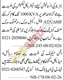 A prominent technical services provider in Karachi has announced new job openings for skilled individuals. The company is seeking qualified Electrical Technicians and Engine Mechanics to join its team. These positions offer a chance for professional growth and stable employment within a supportive environment.