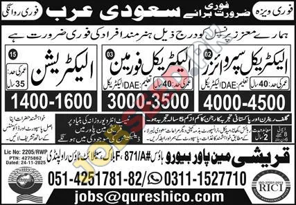 Qureshi Manpower Bureau is seeking talented individuals for immediate placement in Saudi Arabia. We have openings for experienced Electricians, Electrical Foremen and Electrical Supervisors. These are excellent opportunities for professionals looking to advance their careers in a dynamic environment.