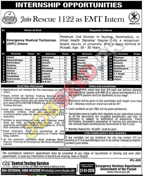 Emergency Services Department, Government of the Punjab (Rescue 1122), Lahore invites applications from eligible candidates for the post of Emergency Medical Technician (EMT) Intern as per advertisement of 10 January, 2026, published in Newspaper. Master educational qualification will be preferred.