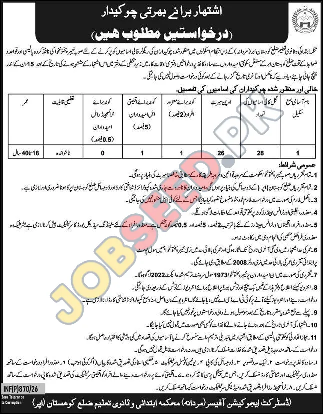 The Government of Khyber Pakhtunkhwa is seeking applications for Chowkidar positions at schools located in Upper Kohistan District. This is an excellent opportunity for local residents to find government jobs in a supportive environment. The recruitment is based on the Khyber Pakhtunkhwa policy and guidelines. For eligible candidates, this is a path to secure employment and build a career in the public sector with the latest job openings. This is a unique opening with a competitive salary and excellent benefits.