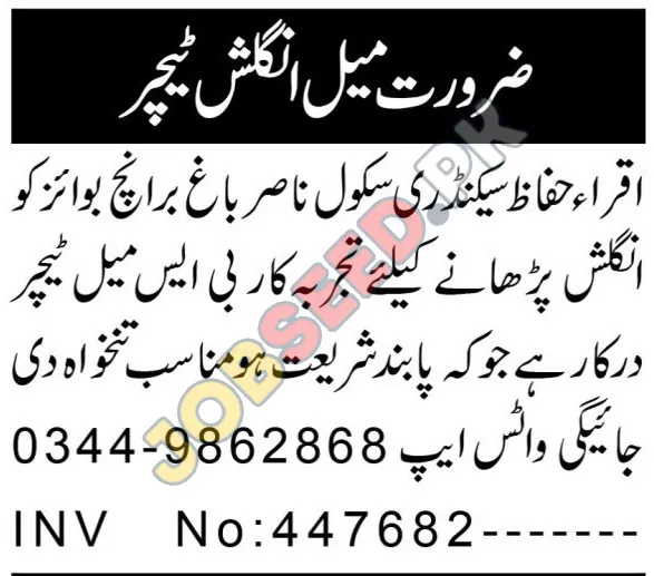 Iqra Hifaz Secondary School's Nasir Bagh Branch (Boys) is seeking a dedicated and experienced English Teacher to join their team. If you are passionate about education, have a strong command of the English language, and a commitment to teaching excellence, this is an excellent opportunity to make a real difference in the lives of students.