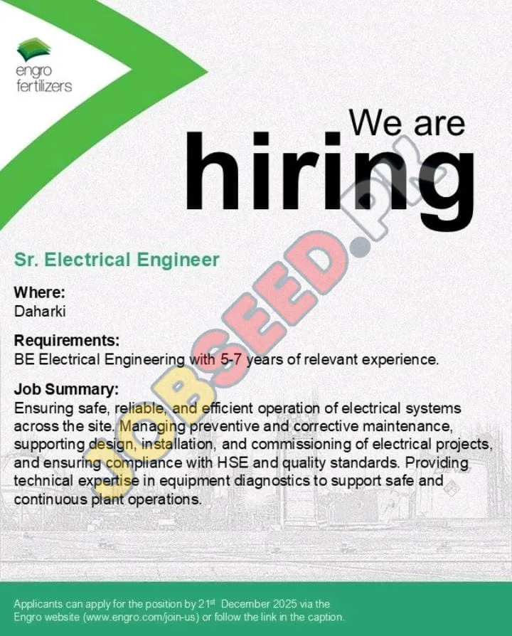 Engro Fertilizers, Daharki invites applications from eligible candidates for the post of Senior Electrical Engineer as per advertisement of 15 December, 2025, published in Image Advertisement. BE educational qualification will be preferred.