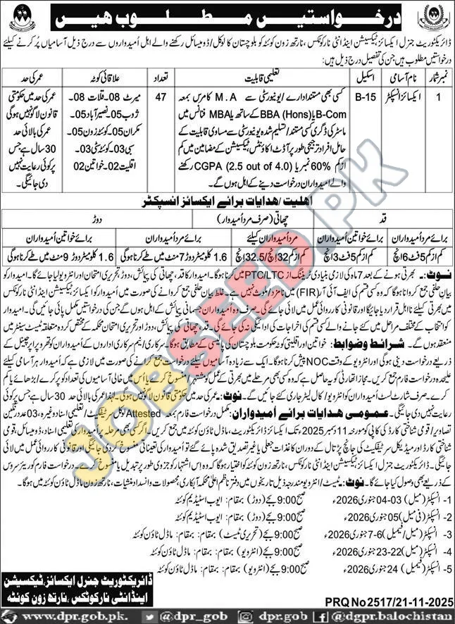 The Directorate General Excise, Taxation & Anti-Narcotics, North Zone Quetta is seeking qualified candidates with local domicile of Balochistan for the position of Excise Inspector (B-15). This is an excellent opportunity to join a dynamic team and contribute to the important work of excise and taxation.