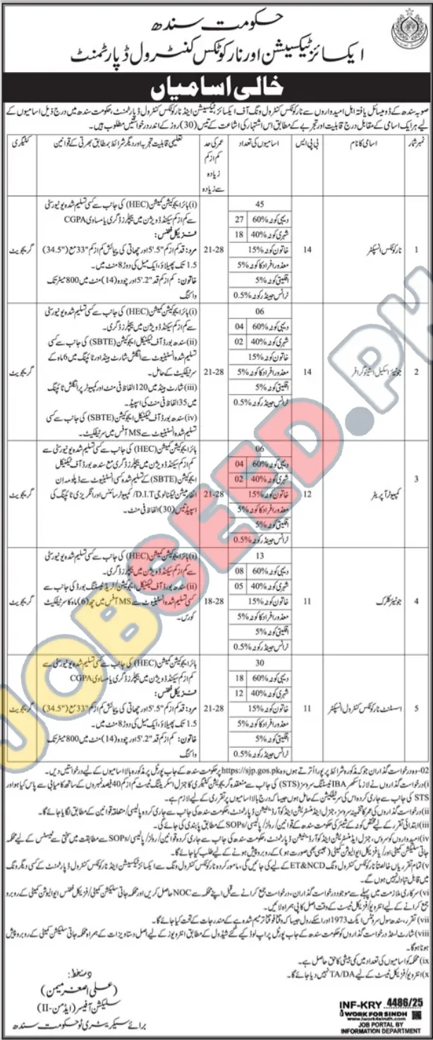 Join the team at Excise Taxation & Narcotics (Sindh) in Karachi, SD. They are seeking to hire 5 qualified individuals for the roles of Narcotics Inspector, Junior Scale Stenographer, Computer Operator, Junior Clerk and Assistant Narcotics Control Inspector. This is a Sindh Government position. This career opportunity was advertised on 25 December, 2025. The last date to apply is 08 January, 2026. Don't miss this chance to advance your career with Excise Taxation & Narcotics (Sindh). For more information and to apply online, visit https://www.jobseed.pk.