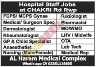 AL Haram Medical Complex is recruiting talented individuals for an array of roles, including Gynae, Radiologist, Medical/Surgeon Spec, Pharmacist, Dermatologist, MO/WMO, Rheumatologist, LHV/Midwife, GP & Child Specialist, OTA, Anaesthetist, Lab Tech, Nursing (Male/Female), and Medical Rep. These positions are available at their Chakri Rd facility in Rawalpindi. This is an invitation to join the private sector and develop your career.